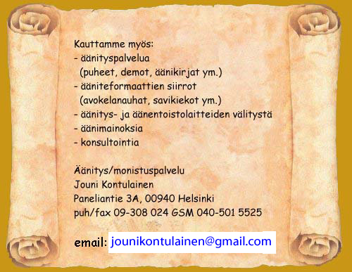 Äänityspalvelua, puheet, demot, äänikirjat Ääniteformaattien siirrot, avokelanauhat, savikiekot Äänityslaitteiden ja äänentoistolaitteiden välitystä Äänimainoksia, konsultointia